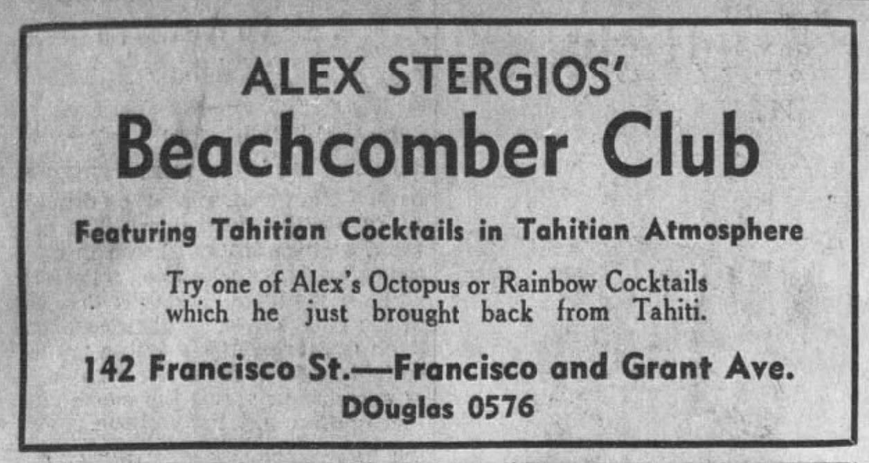 Cocktail documentation — Octopus: Period San Francisco advertising documents that Alex Stergios served an “Octopus Cocktail” by early 1939 at his Beachcomber Club (listed alongside the Rainbow), but no authenticated Stergios recipe for the drink has yet surfaced in primary-source form. A mid-century “Octopus” associated with Waikiki Trader Vic’s appears later in the documented tiki canon; regardless of whether the drinks are related, the shared name is documented earlier in Stergios’ 1939 print advertising than in later Trader Vic’s sources. No evidentiary claim is made here that the formulas are the same absent a dated, measured Stergios recipe.